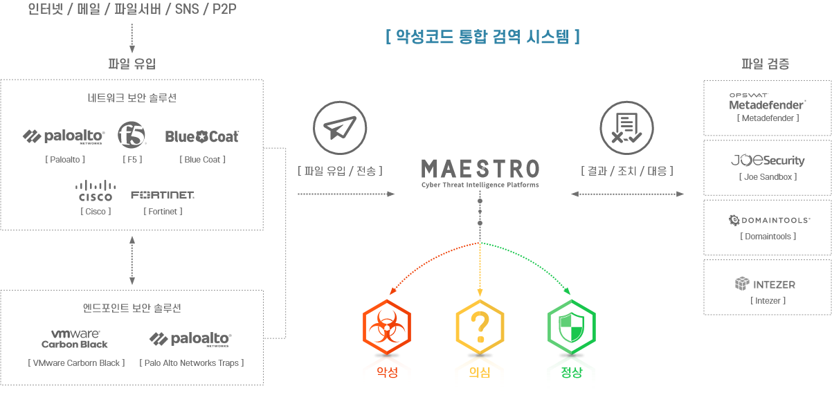 다양한 보안 솔루션들을 [ 마에스트로 사이버 위협 인텔리전스 플랫폼 ] 과 연동하여 기업 내부로 유입되는 파일들에 대하여 악성코드 여부를 자동으로 진단할 수 있습니다.
